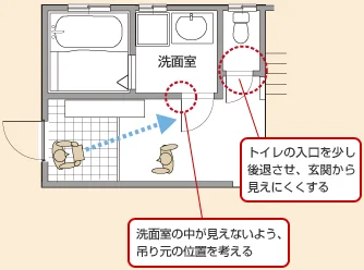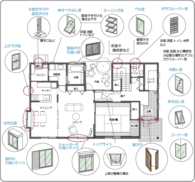 - 洗面室やトイレの窓については、設備機器の高さや幅を考慮して取付位置を決めます。