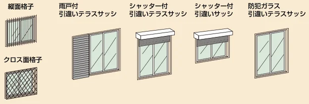- 1階窓開口はテラスサッシ以外は、原則面格子付となります。