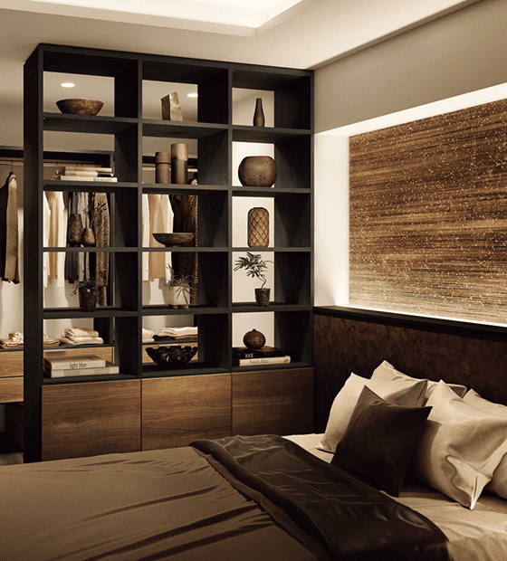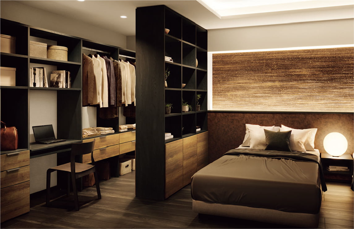 ライフスタイルも多様化している現代、個室を分けなくてもベッドの間を収納などでゆるやかに仕切れば互いの睡眠を邪魔せず存在を感じることができます。