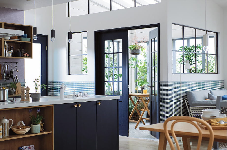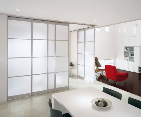 最近はダイニングとリビングを壁で区切らず、代わりに仕切り窓を設置するのが人気です。ドアを極力使わず素通りするような間取りが増えています。空間をゆるやかに区切ると、多目的に使いやすくなると同時に、視界が広がり、光や空気の通りも良くなるのが利点です。エアコンの機能、建材の断熱性は向上していますから、そんなにしっかり区切らなくても暑さや寒さの対策上は問題ありません。