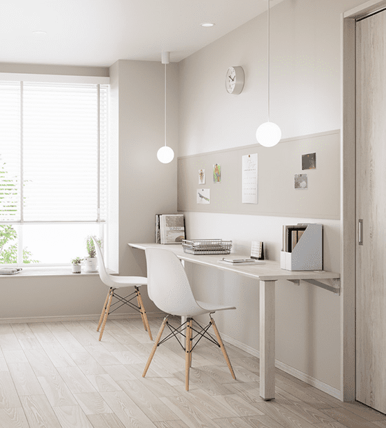 次に2人の場合を見ていきましょう。まず共働きのケース。どちらか1人、または2人とも自宅でリモートワークというのはごく一般的ですから、ワークスペースをどう確保するかがポイントになってきます。小さくてもいいので2つあるといいですね。それと併せて、オン/オフの切り替えがしやすいかも留意したいところです。