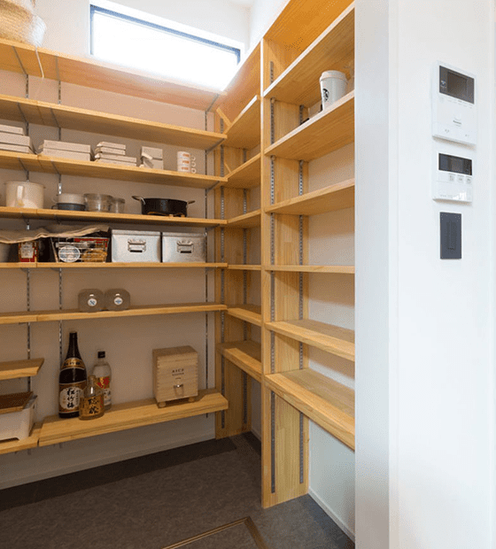 保存食や細々とした調味料は、大きなパントリーにまとめて収納。LDKがすっきりして見えます。