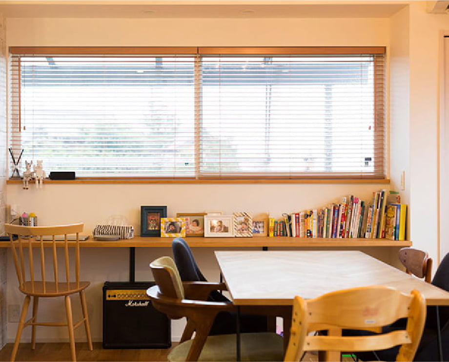 リビングの壁一面にデスクを設置した例。親の仕事スペースとしても、子どもの勉強スペースとしても使えて便利。(タブチさん施工例より)
