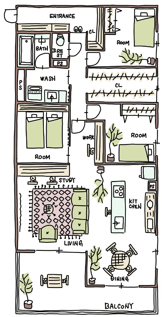 最後に3~4人の子育て世帯。かつての「夢のマイホーム」の時代と比べて、子ども部屋が明らかに狭くなっています。「いずれ子どもたちは巣立っていくのだから、スペースが無駄になりかねない」と認識される親御さんが増えました。「子ども部屋を狭くする分LDKを広くしたい」という意見をよく耳にします。家族が集まりやすく、そこでお子さんは宿題ができて、親御さんの仕事スペースにもなるように、というわけです。