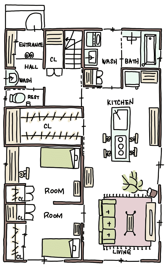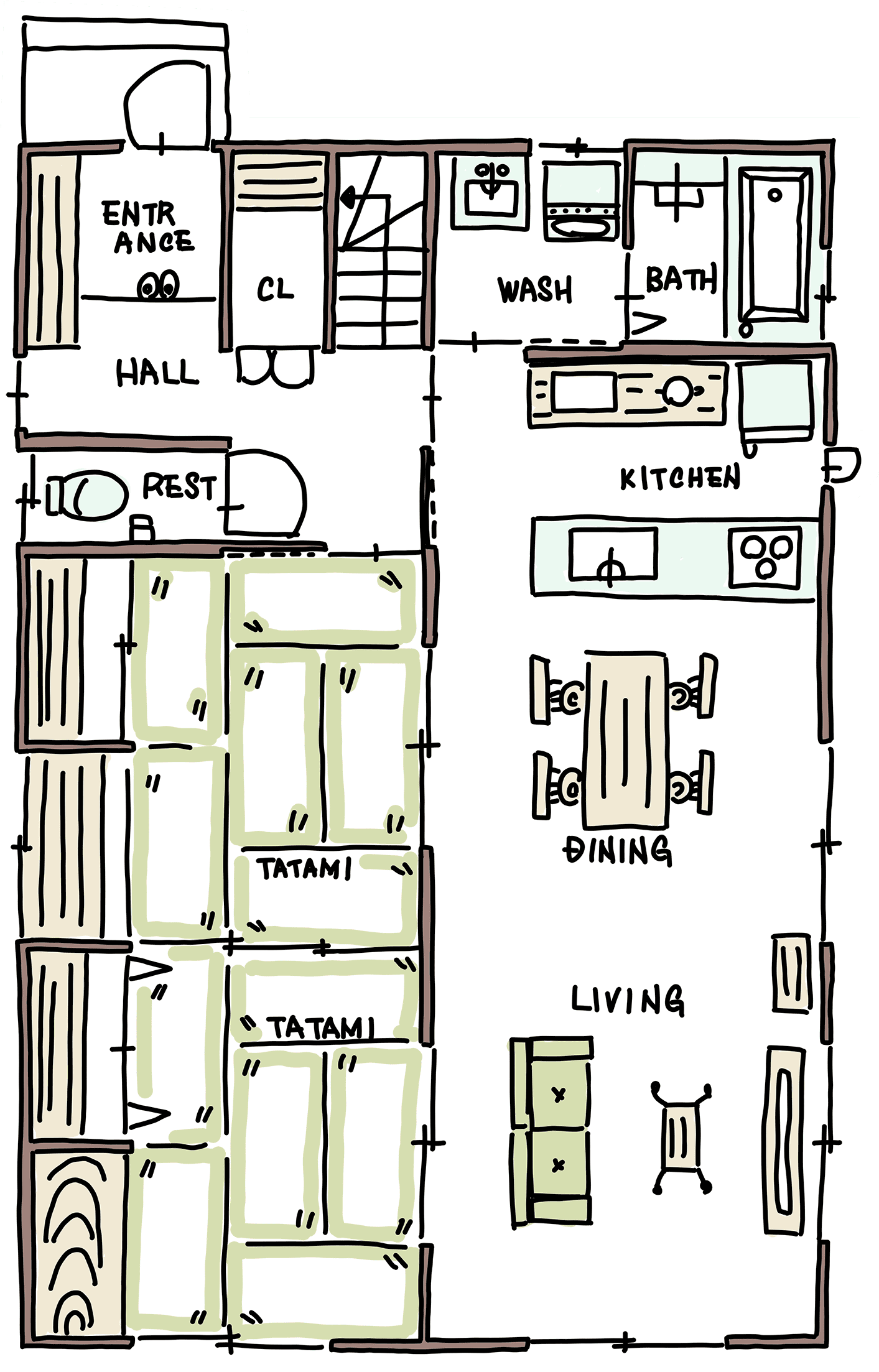 そんな一人暮らしの方からどんなニーズが生まれるのか。私も手がけた事例は決して多くありませんので、鋭意研究中です。その人のライフスタイル次第ではありますが、カフェのラウンジみたいにお客さんをおもてなしできる空間を求める声があります。私が最近担当した女性のお施主様2人は、どちらもそのような要望でした。リビングルームは応接室を兼ねてある程度広く、リッチな作りに。その分DKはささっと食事を済ませられる程度にコンパクトに。そんなご要望をお伺いしながら間取りを固めていきました。