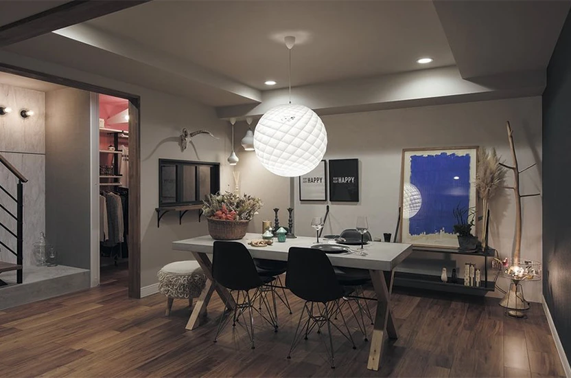 天井にシーリングライトを一灯という配置ではなく、ダウンライト・間接照明・ペンダントライト・フロアランプなどを複数組み合わせる「多灯分散」で、空間に陰影と奥行きをつくるのがおすすめです。色温度もポイントで、くつろぎ空間には電球色(あたたかいオレンジ系)、作業空間には昼白色(白い光)など、シーンに応じた使い分けが空間の“質”を左右します。
