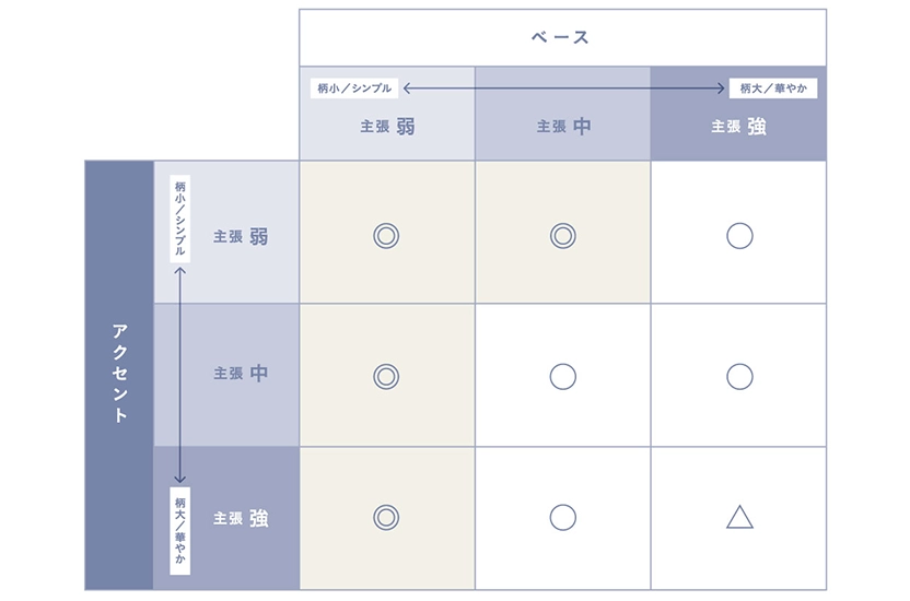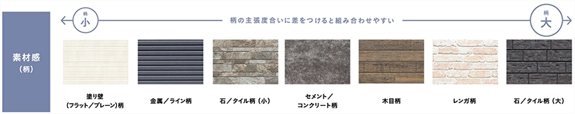 色同士はトーンを近く、素材感同士では柄のサイズに差をつけると、統一感が生まれ飽きのこない外観にすることができます。素材感の組み合わせには相性の早見表を用意していますので、参考にしてください。