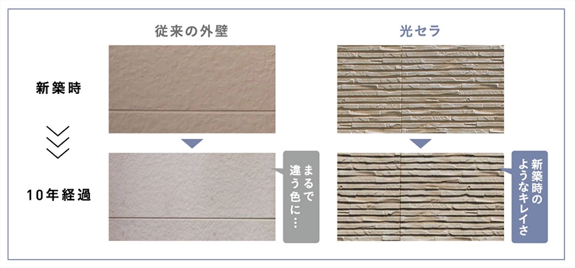 外壁や屋根のメンテナンスを軽減するためには、最新技術の活用が効果的です。特に注目されるのが「長期保証」と「セルフクリーニング機能」です。ケイミュー株式会社の「光セラ」は、太陽光と雨水の力で汚れを浮かせて洗い流すセルフクリーニング機能を備え、外壁を美しく保ちやすいのが特長です。また、40年保証が付いており、従来10~15年ごとに必要だった補修の手間を大幅に減らすことができます。美観の維持だけでなく、清掃や塗り替えの頻度も抑えられるため、長期的なメンテナンスコストの削減にもつながります。