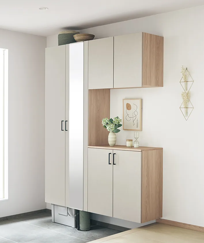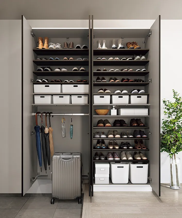 靴は、家族それぞれの収納位置を決めて、履かないときは定位置に戻す習慣を。子どもの靴は下段にして、自分で出し入れできるようにしましょう。
