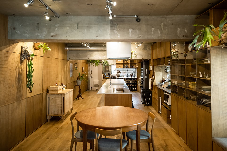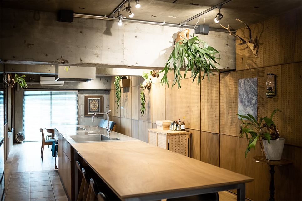 奥の玄関からダイレクトにLDKにつながる自宅がおもてなしの場。有孔ボードやラワン材を多用した、インダストリアルな雰囲気が漂う