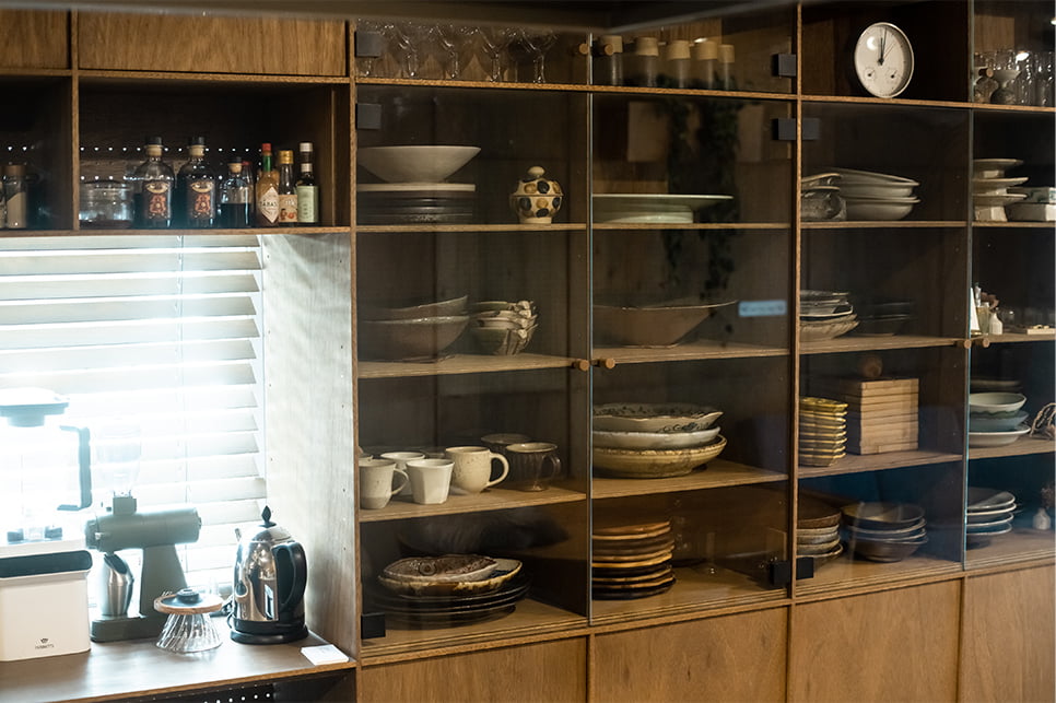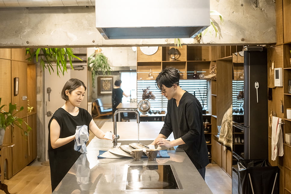 ふたりが対面でも作業しやすいアイランド型の造作キッチン。器は料理やシーンに合わせて、ふたりで相談しながら選ぶ