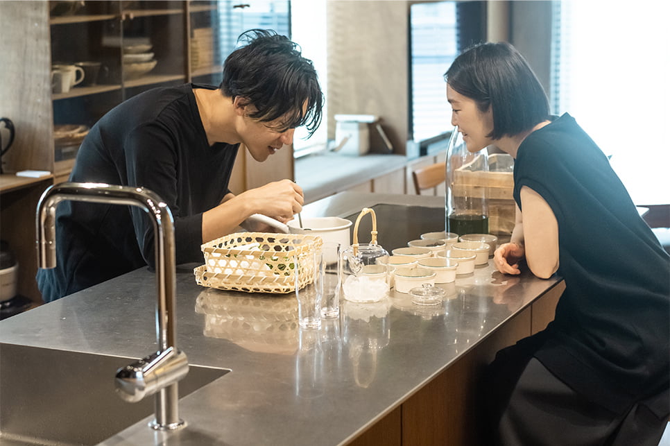 農園から取り寄せたフレッシュハーブでハーブティを煎れる豪希さん。理科の実験のように丁寧な手つきで作業する豪希さんを楽し気に見守る桃子さんと、「器はこちらの方がいいんじゃない」と会話が途切れることなく続く。「ハーブティをおいしく煎れるには、弱火でじっくり煮出すのがコツ」と豪希さん。仕上げに自家製の青紫蘇シロップを加えて
