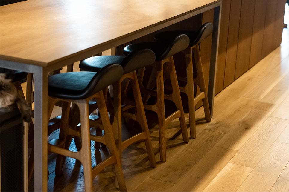 豪希さんが包丁をふるいやすい高さに設定したキッチンカウンターや、造作のワイドシンク、カウンターにサイズを合わせたダイニング兼ワークテーブルなど、キッチンまわりは料理がしやすく、また来客の際のもてなしもスムーズになる工夫がいっぱいです。「料理するところを見ているのが好き」という桃子さんの定位置は、カウンターの向かい側。ここで豪希さんの手元を見ながら味見をしたり、下ごしらえを手伝ったりしつつ、ふたりの会話もはずみます。