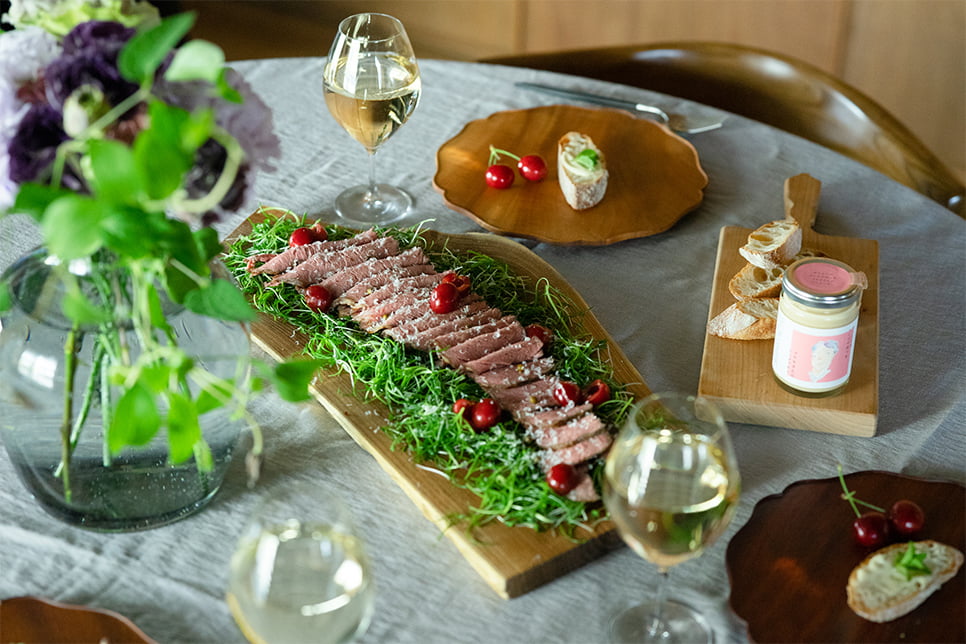 豪希さんの料理と桃子さんのおもてなし演出による「てとてと食堂」は、集まる人たちの好みやスタイルに合わせてオーダーメイド感覚の料理を提案するホームパーティ。オープンなLDKなので、ふたりとお客さまの垣根がなく、豪希さんが調理しているところを間近で見られるのも魅力。