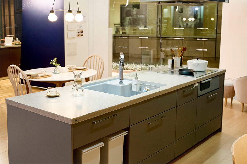 ショウルームに展示されているLクラスキッチンIdobataスタイルは、ふたりのライフスタイルに通じる、適度な距離感で作業ができ、家族のコミュニケーションもはかれるプランです。その秘密は、センターにあるシンクを挟んで2か所に作業スペースがあること。さらに、端の作業スペースの下はオープンユニットなので、対面側にスツールを置いて座れば軽食スペースとしても活用できます。