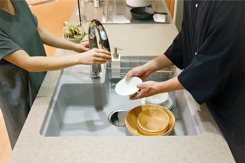 LクラスキッチンIdobataスタイルは、シンクの両サイドに作業スペースがあるのが大きな特長。ふたりが並んでも、対面でも調理がしやすい。「豪希さんが料理している間に私が洗い物をしても、お互いに邪魔にならなそう」と桃子さん。「お客さまと一緒に料理をしても楽しそう」と豪希さん