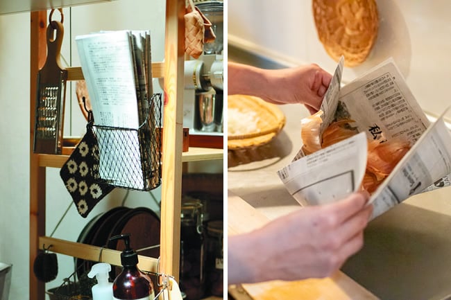 生ごみカゴや洗い桶をシンクに置けば、それぞれのそうじも面倒なので思い切って手放しました。調理する際に出たゴミは、その都度新聞紙を広げてくるむスタイルで処理。その後は作業台脇につるした紙袋にポンと入れるだけ。新聞紙はすぐ手にとれるようにキッチン脇の棚にセットしています。