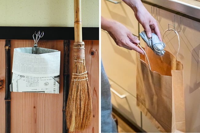 「わが家は京町屋で縦に長く、ごみを集めるのもひと苦労。そこで、使い捨ての紙袋を代用することを思いつきました」。これなら各部屋のごみ袋を回収するだけ。壁に吊るすので床掃除もスムーズなうえ、ごみ箱の周囲を掃除する手間も省けました。紙袋は、買い物でもらった小ぶりのものを使ったり、新聞紙を折って作ることもあります。