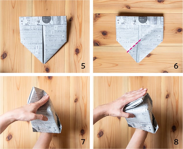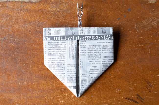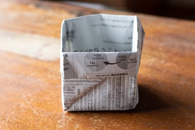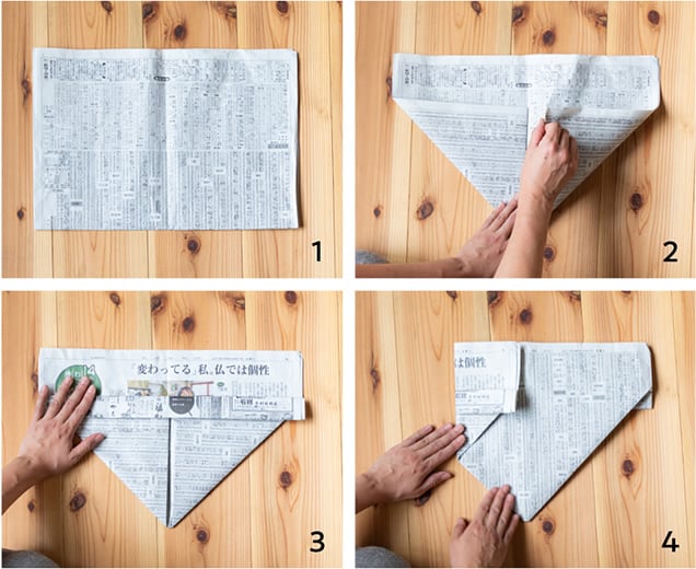 - ①新聞紙1枚(2面分)を折り山で折って、折り山を下に置く。