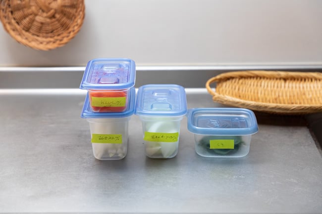 冷蔵庫内のストックをひと目で把握できるように、透明の保存容器を活用。マスキングテープでラベリングして、種類や下ごしらえした日を書き込んでいるので、使い残しも防げます。以前は冷蔵庫の中身を書き出していたけれど、この方が簡単と変更したそう。こうした見直しも家事効率を上げるポイントです。