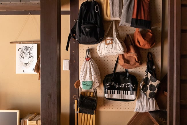 階段脇の壁面に有孔ボードを設置して、フックで家族のバッグをハンギング収納。下の方は背の低い子どもたち、上の方は親のバッグの位置と決めて、各々が自分で出し入れしています。スペースが空いていれば、しまい忘れの合図。家族全員がパッと見て状態を把握できます。