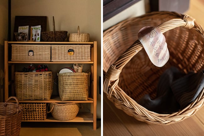 子どもの持ちものは、しまう場所へうまく誘導して、簡単に収納できるようにしています。2人分のおもちゃなどは、カゴに姉弟の顔を模したシールを貼ってパッと場所がわかるように工夫(写真左)。脱ぎ散らかしがちなくつ下は、玄関先に「くつ下脱いで入れてね」とメッセージを添えたカゴへ。カゴ収納はワンアクションで出し入れできるので片付け下手でも安心です(写真右)。
