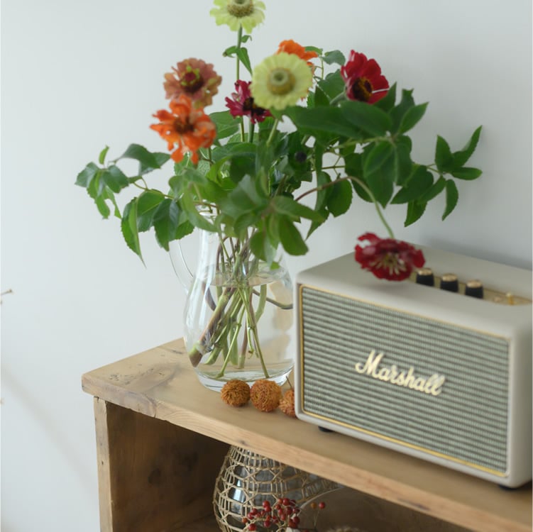 今、Harunaさんが気に入っているのは、農薬を使わず露地栽培されたオーガニックフラワー。シャキッと伸びた一般的な切り花にはない、自然な動きの茎や葉、不ぞろいの花が魅力です。ナチュラルスタイルのインテリアに自然にフィットし、おふたりらしい空間のエッセンスになっています。