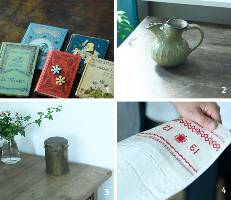 - 集めているアンティークの書籍。「デンマークの家庭では本を色別に収納したり、好きな本のデザインを見せるように飾ったりと、インテリアの一部にしているんです」。