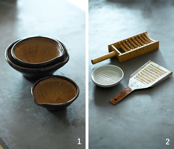 - 食感を大切にするワタナベさんにとって、料理によっておろし器を使い分けるのは鉄則。「焼き魚にはなめらかな食感に仕上がるおろし金が合いますし、鬼おろしはザクザクとした食感を生かせる鍋のほか、人参と大根を一緒にすりおろしてあえ物にもします」。