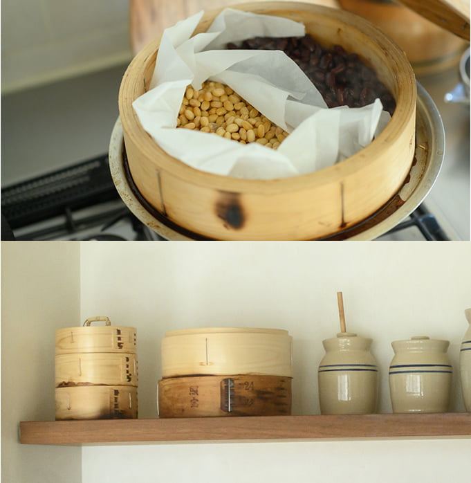 ワタナベさん流の蒸籠づかいには、新鮮な使い方のヒントがいっぱい! 冷ごはんやうなぎの温め直し、豆や卵を蒸す、味を浸透させるなど、毎日さまざまに活用しています。檜製の中華蒸籠をサイズ別に数個愛用中。なかには15年以上使っているものもあるそう。