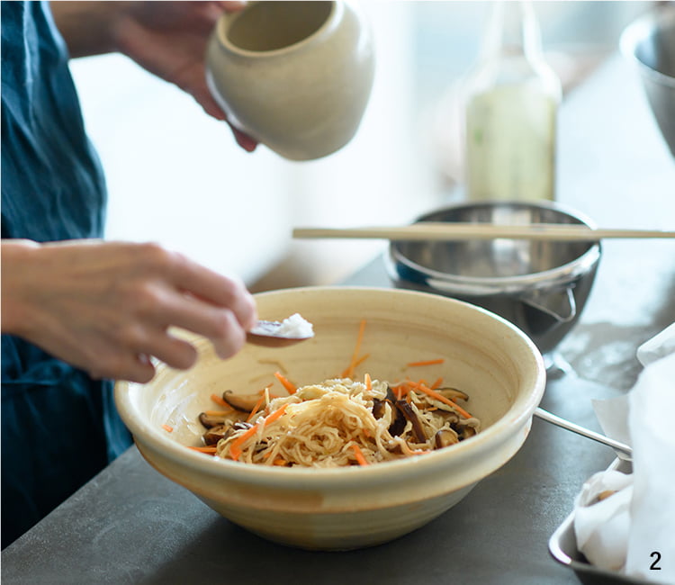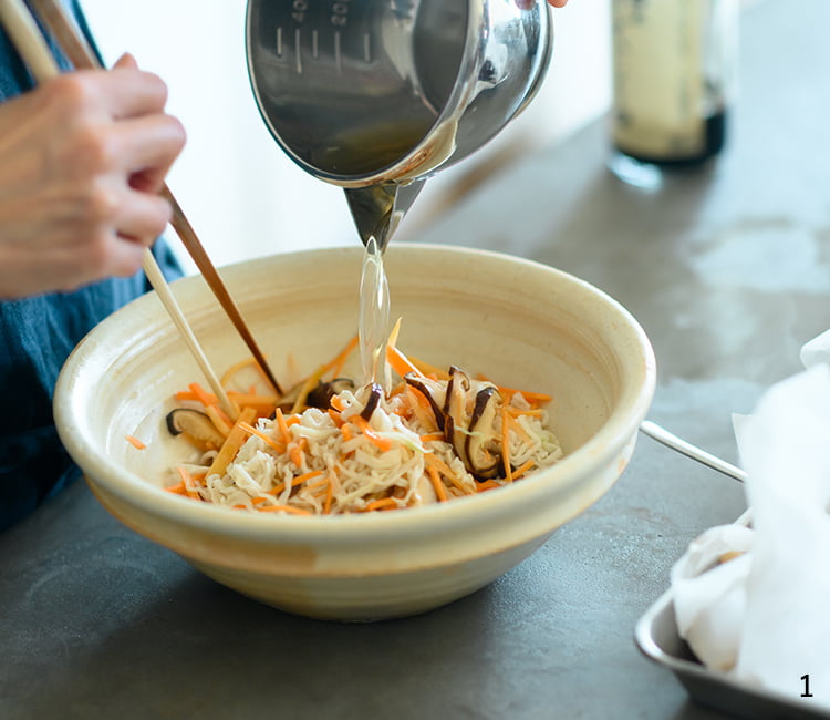 - 水に戻して食べやすく切った切り干し大根、千切りの人参、水に戻して千切りした干ししいたけ、千切りのしょうがを器に入れて混ぜ、煮汁(干ししいたけの戻し汁、酒、しょう油、みりん)を注ぐ。