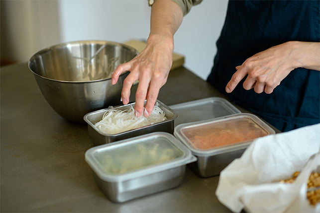「たとえば、夕食用に大根を切るときには多めに切って、残りは塩もみして冷蔵庫へ。そうすると次に使いやすいし、使い忘れも防げます」とワタナベさん。人参やキャベツ、ねぎなども同様に、使い切れずにしなびてしまわないように、塩もみしてからストックするそう。