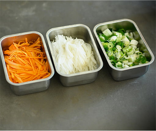 人参や大根は千切りに、ねぎは小口切りにして塩もみに。大体2~3回で使い切れる量をおいしくいただく目安とし、ストックするのは2種類位までと決めています。「素材により塩と油であえておくこともあります」。