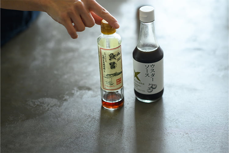 「魚醤はコクとうま味があるので、炒め物やさっと煮などに、しょう油代わりの感覚で使えます。ウスターソースもうま味が凝縮されていて優秀! カレーやトマトソースの下味、肉の匂い消しにも有効です」。