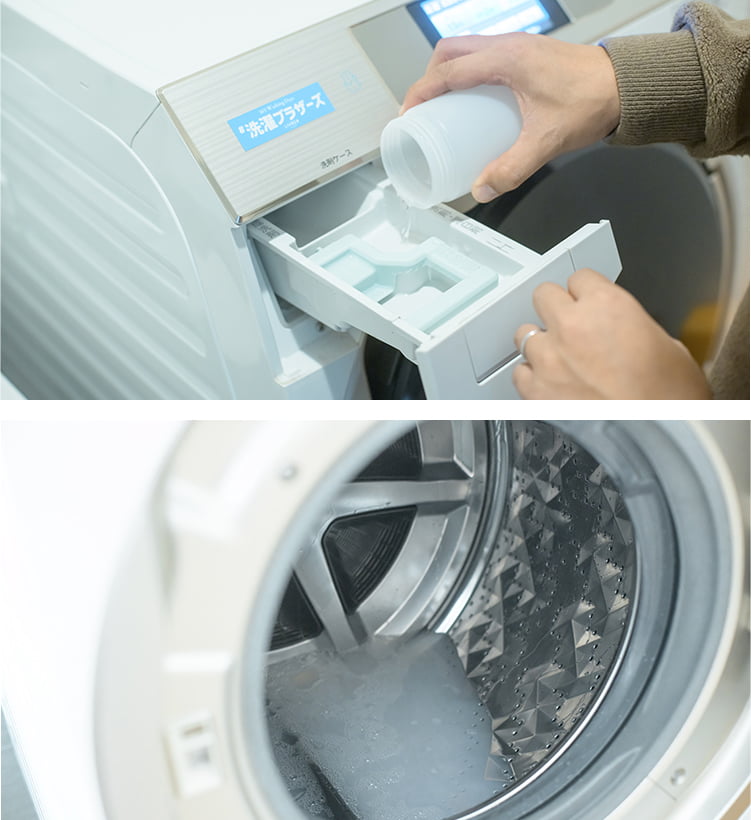 きれいにするには、市販の洗濯槽クリーナー(酸素系漂白剤を使ったもの)を使用。
