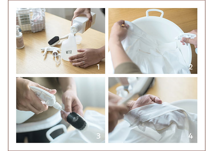- 襟元の黄ばみなど、しつこい汚れがある場合は2のスプレーの後、洗濯用ブラシにも1をスプレー。ブラシで汚れた部分をトントン叩き、汚れをしっかり浮き上がらせてから洗濯機へ。ブラシでこすると生地が傷むので、叩くのがおすすめ。