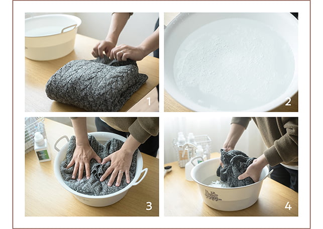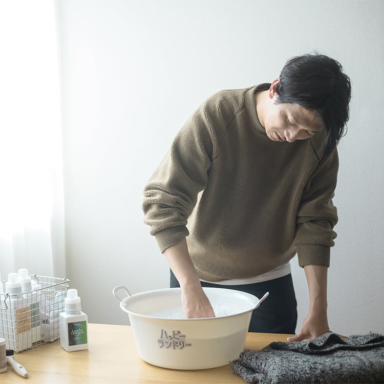 - ウォッシュタブにニットを入れ、水を含ませながらゆっくり沈める。「押して沈める」→「やさしく水から上げて水分を落とす」を3分ほど続ける。途中、衣類を裏返して同じように洗い、まんべんなく汚れを落とす。