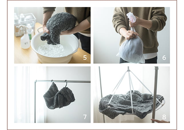 - 洗濯ネットに5を入れ、ネットの中で動かないように余っている部分をしばる。洗濯機に入れ、デリケート衣料の洗濯モードで1分間脱水する。ネットから一度取り出し、ウォッシュタブにきれいな水を張り直して3 ~ 6をもう一度繰り返し、残った洗剤と汚れを落とす。