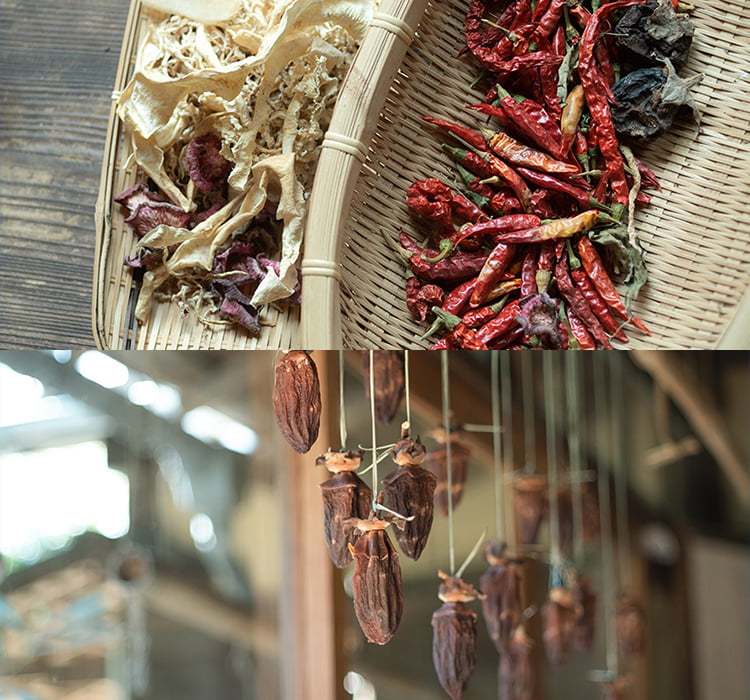 四季折々の旬の食材は、その季節に食べるだけでなく、保存食でも楽しんでいます。乾物は保存性が高まるだけでなく、うま味が凝縮する、ビタミンDが摂れるといったメリットも。あたたかな陽光が注ぐ広縁を干し場として活用し、四季折々の野草や果物、畑で採れた野菜を一年中並べています。