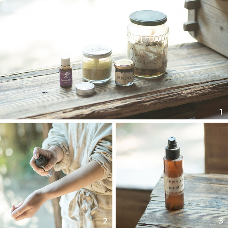 - 右からビワの葉を焼酎に漬けたエキス、青梅をすりおろして絞り、じっくり煮詰めた梅肉 エキス。残りはキハダの粉末、シアバターやオイルなどを調合したもの、ラベンダーオイル。