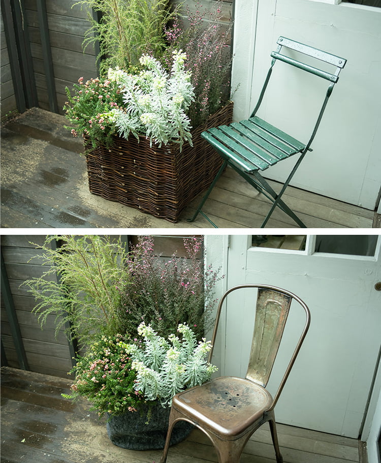 下/グレーのフェルト地の鉢カバーと、業務用のメタルチェアを組み合わせて、シャープな雰囲気に。