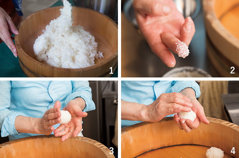 - 手を洗い、炊き上がったごはん、塩、手水を用意する。