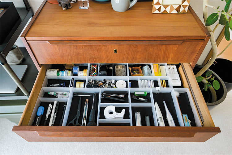 みんなで共有する物は、わかりやすさも大切。LDKの引き出しにしまった文具や体温計などは、仕切りをつけて物同士が重ならないように配置し、ひと目でわかるようにしています。