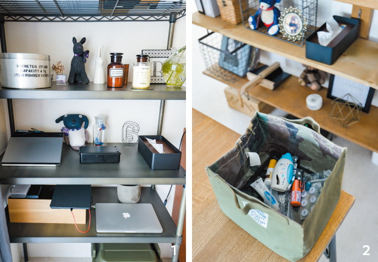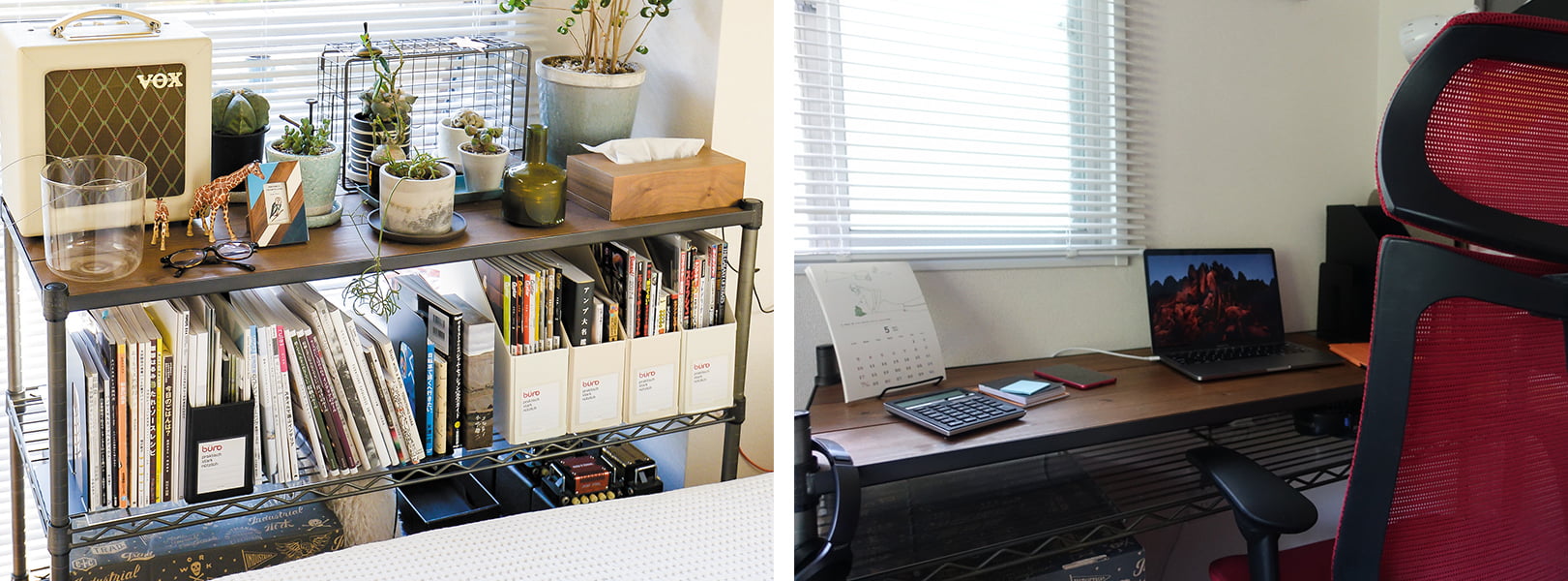リモートワークをするようになったご主人は、当初LDKのダイニングテーブルで仕事をしていたそうですが、より集中できるようにと、寝室に仕事スペースを創出。本棚兼ディスプレイ台として使っていた棚(写真左)の小物を移動させ、棚板の高さを調整してデスクにアレンジしました(写真右)。