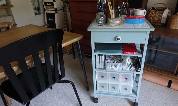 美術系の学校に通うお嬢さんが絵を描く道具を収納した家具。キッチンワゴンとして使っていた物に小引き出しを入れるなどしてアレンジしました。キャスターつきなので、LDKで作業する際に自室と簡単に行き来できて便利。趣味の道具や小さなお子さんのおもちゃ収納など、幅広く応用できるアイディア。