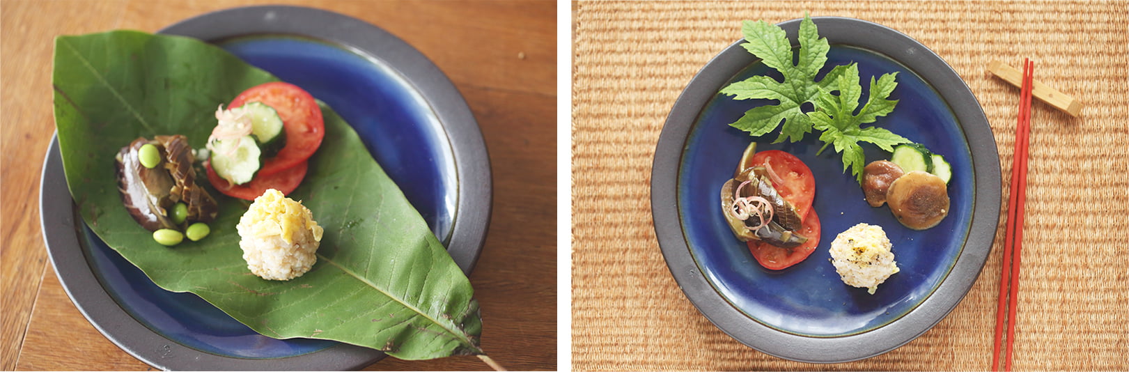 「切り花や枝葉を見て季節を味わえるのは、日本人らしい感性ですよね。緑を添えることで料理がよりおいしそうに映えるうえ、ふだんの食卓にちょっとしたおもてなし感も出ます。夏は、プランターで育てている青じそやゴーヤーの葉もよく使いますね。青じそは料理にも使えるし、使い勝手がいいのもポイント。わざわざ購入しなくても、身近にある草花を使って、季節をを楽しんでみてくださいね」。