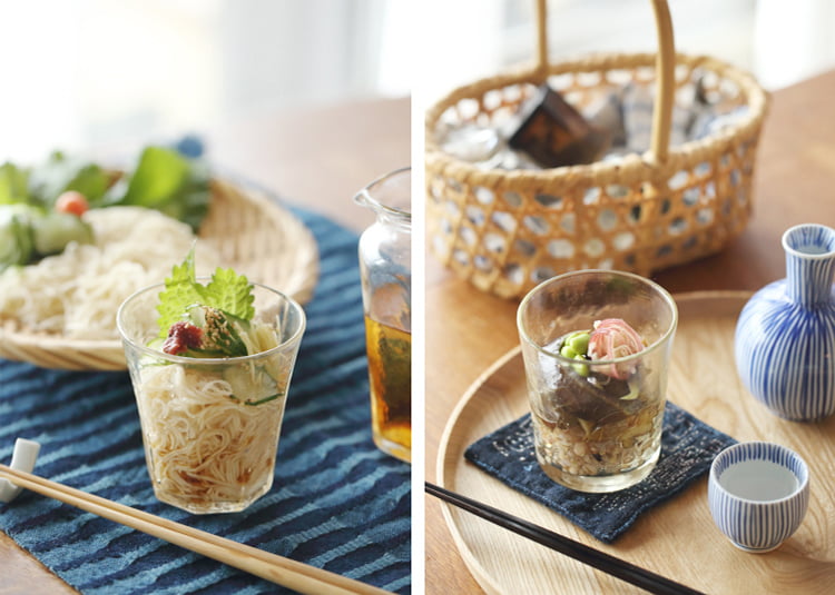 夏用の器といえばガラス素材のイメージですが、手持ちにはないことも多いのでは。そこでminokamoさんがおすすめしてくれたのが、ガラスのコップの活用です。「いつも使っているコップをそば猪口代わりに使ってみたり(写真左)、冷菜を盛る(写真右)のもおすすめ」。写真の冷菜は、雑穀マリネの上に、枝豆やみょうがを添えた蒸しなすを盛って軽食スタイルに。「深さのあるコップで、複数の層に盛りつけるのも楽しいですよね」。
