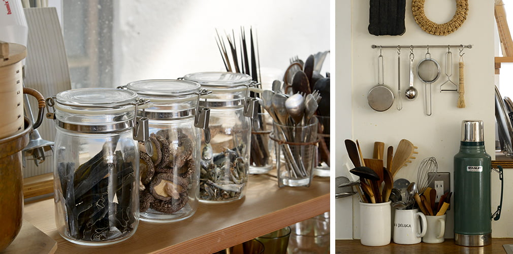フライパンに五徳、鍋敷き、レードル……。「テラ・コヤ」のキッチンスペースは、キッチン道具が壁面や棚をにぎやかに飾る楽しい空間。まるでアートをディスプレイしたような見ごたえのあるオープン収納ですが、実は、「機能的に使えるものだけを取り出しやすいスタイルでしまっているだけです」と寺林さん。機能を優先させながらも、サイズや形のとり合わせなど、眞紀さんが配置のバランスを考えて収納することで、楽しげに見せています。
