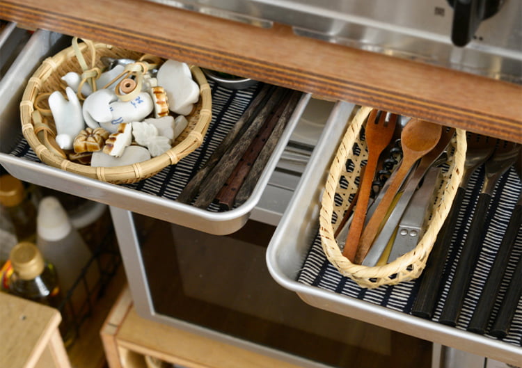 たとえば、コンロ下にレールをつけてカトラリーを入れたバットを引き出しにしたり、キャスターつきの電子レンジ台を作ったり。どれも構想は眞紀さんで、製作は寺林さんが担当。製作の段階で寺林さんがアレンジを加えることもあるそうで、ふたり揃って考えることで、より使い勝手よく仕上がるメリットも生まれます。