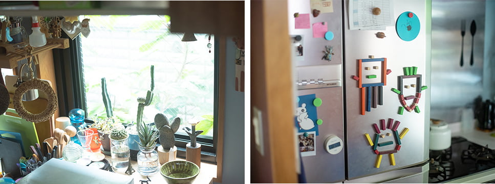 カラフルでポップな食の提案が人気の「Goma」ですが、アラキさんのお宅のキッチンを見てみると、そんな作風にもつながる楽しげな雰囲気。マグネットを組み合わせて冷蔵庫の扉にイラストを描いたり、レンジフードに小さなおもちゃを並べてみたり……。「若い頃から買い集めてきたいろいろな“好きな物”が集まっている、“ムダな物が多い場所”なんです」とアラキさん。